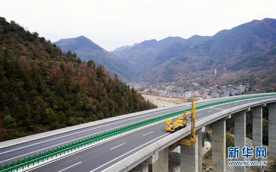 11月20日,在水陽(yáng)高速公路左家灣特大橋上,橋梁檢測(cè)車在進(jìn)行通車前的檢測(cè)作業(yè)(無(wú)人機(jī)拍攝)。 近日,記者從陜西省交通建設(shè)集團(tuán)公司了解到,陜西柞水至山陽(yáng)高速公路已全線貫通即將通車。據(jù)介紹,(柞)水(山)陽(yáng)高速公路全長(zhǎng)78.8公里,開通后將實(shí)現(xiàn)包茂高速、福銀高速在陜南商洛地區(qū)的連接,開辟出秦嶺南麓的一條橫向高速大通道,對(duì)完善陜西高速公路路網(wǎng)結(jié)構(gòu)、促進(jìn)陜南區(qū)域經(jīng)濟(jì)發(fā)展、加快山區(qū)群眾脫貧致富具有重要意義。 新華社記者劉瀟攝