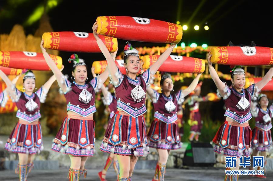 11月21日,演員表演舞蹈《天鼓神韻》。 當日,廣西柳州市第一屆旅游產(chǎn)業(yè)發(fā)展大會暨2018第十八屆中國·融水苗族蘆笙斗馬節(jié)開幕式晚會在融水苗族自治縣舉行。 新華社記者 周華 攝
