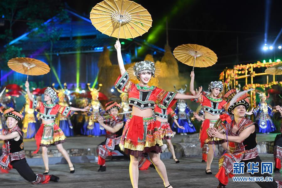 11月21日,演員表演歌舞《依依送客》。 當(dāng)日,廣西柳州市第一屆旅游產(chǎn)業(yè)發(fā)展大會暨2018第十八屆中國·融水苗族蘆笙斗馬節(jié)開幕式晚會在融水苗族自治縣舉行。 新華社記者 周華 攝