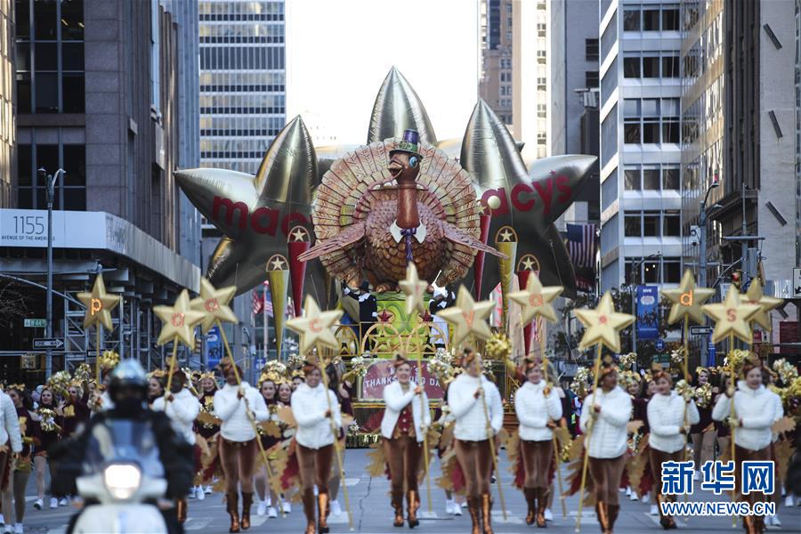 當(dāng)日,第92屆梅西感恩節(jié)大游行在紐約舉行,各式各樣的玩偶?xì)馇?、花?chē)隊(duì)伍在曼哈頓的摩天大樓間穿行,吸引數(shù)百萬(wàn)民眾前來(lái)觀看。梅西感恩節(jié)大游行始于1924年,是全美規(guī)模最大的感恩節(jié)游行。