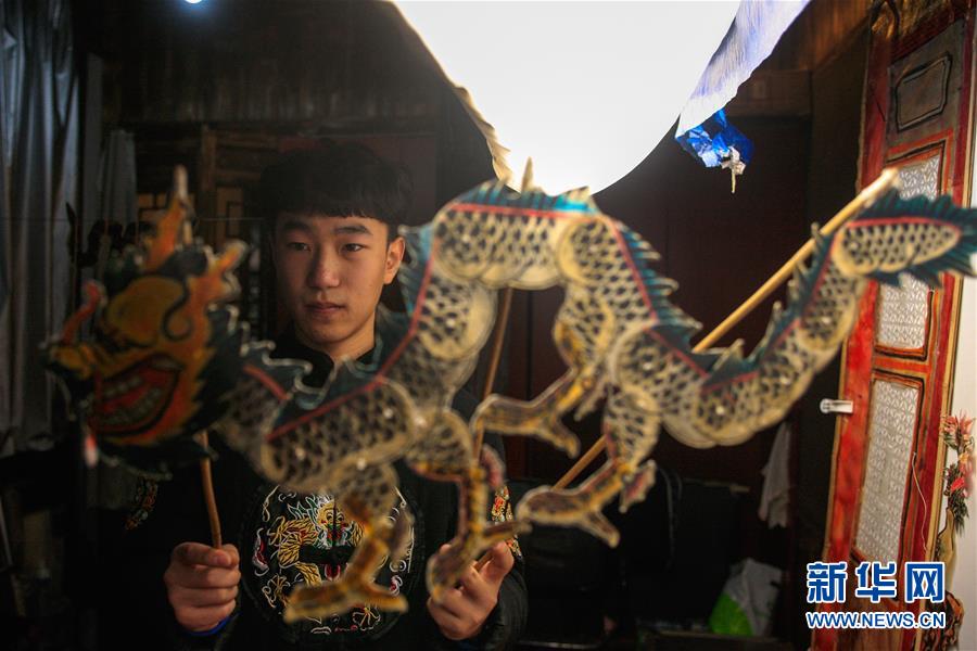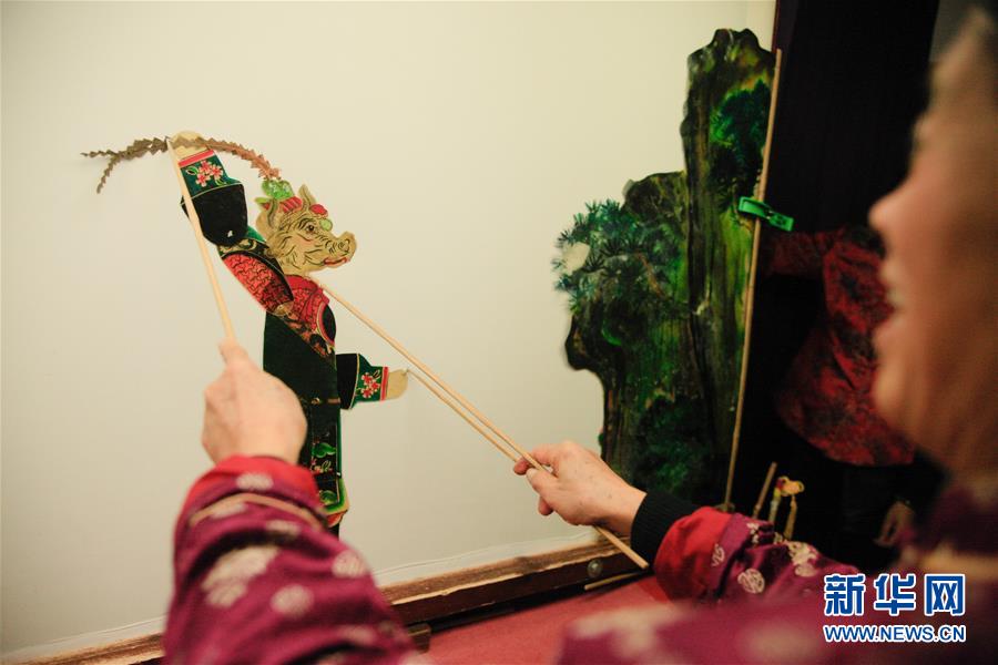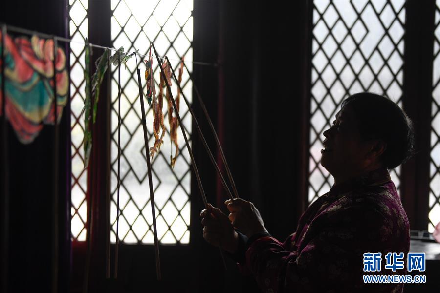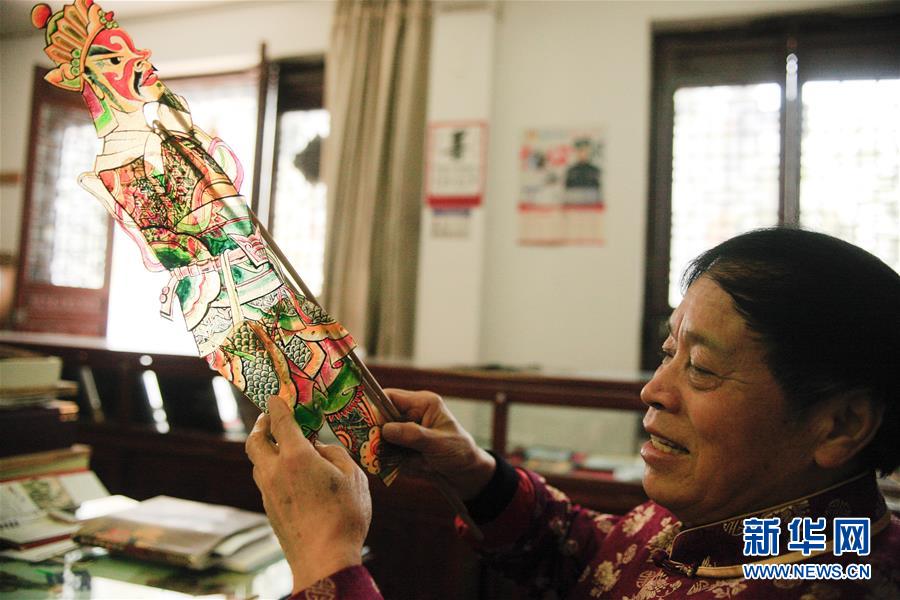 11月20日,在浙江海寧市南關(guān)廂歷史街區(qū),張坤榮在表演皮影戲前做準(zhǔn)備。新華社記者黃宗治攝