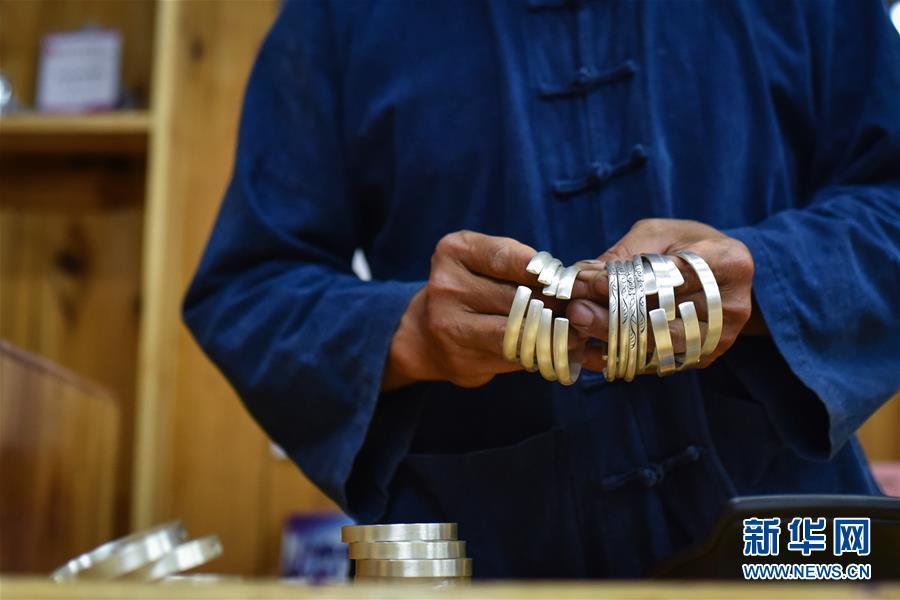 8月3日,銀匠龍懂陽在銀飾店內(nèi)清點(diǎn)制作完成的銀質(zhì)手鐲。