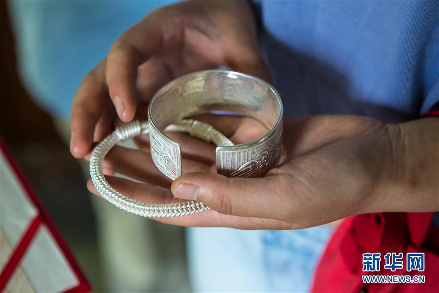 8月3日,唐白梅展示自己在龍懂陽的銀飾店里制作的銀鐲子。