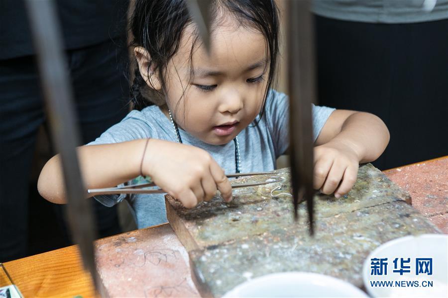 8月3日,來自西安的小朋友月白在龍?zhí)栥y飾體驗(yàn)工作室中學(xué)習(xí)制作銀飾。