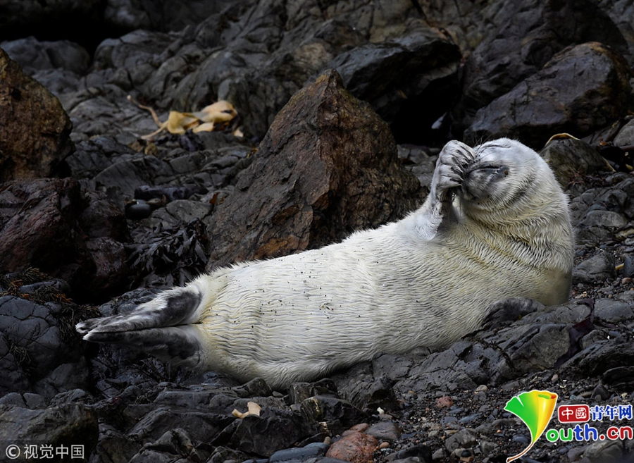 中國(guó)青年網(wǎng)北京10月9日電 當(dāng)?shù)貢r(shí)間2018年10月8日,英國(guó)彭布羅克郡,一只大西洋海豹幼崽躺在海邊礁石上。海豹幼崽出生時(shí)都有毛茸茸的白色非防水皮毛,它們會(huì)在第四周蛻皮。