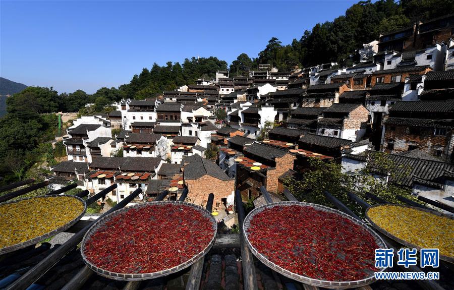 2017年10月26日拍攝的篁嶺古村。家家戶戶晾曬各種蔬果及皇菊。近日天氣晴朗,江西省婺源縣江灣鎮(zhèn)篁嶺村村民抓住時(shí)機(jī)采摘、晾曬皇菊及蔬果。明黃的菊花、火紅的辣椒……各種顏色將篁嶺古村裝扮成巨大的“調(diào)色板”,引來眾多游客感受鄉(xiāng)村美景。新華社記者宋振平 攝