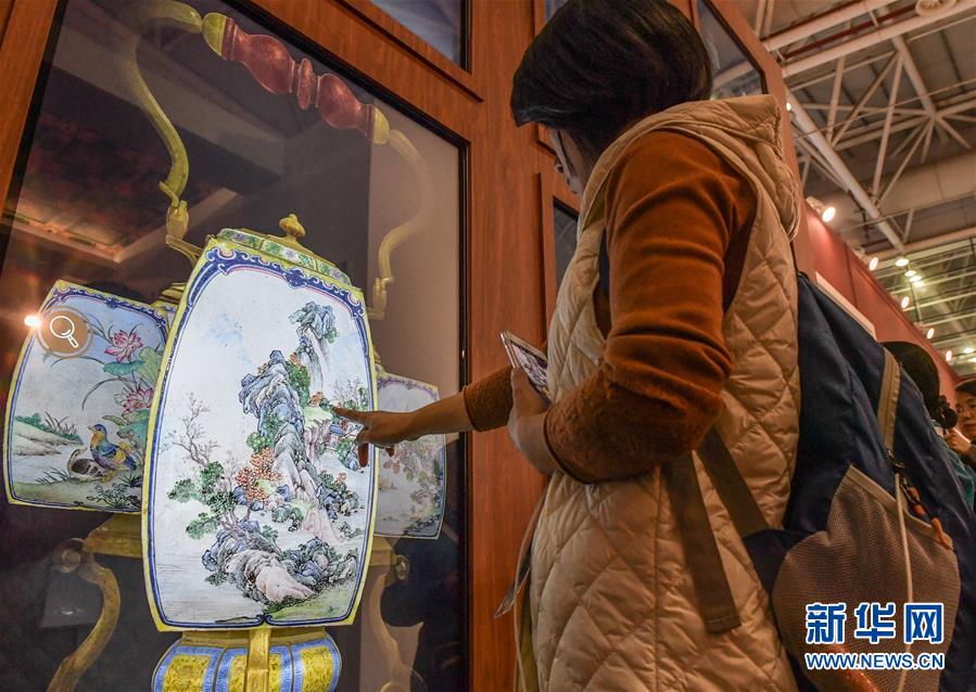 11月23日,兩位參觀者在“博博會”上觀看文創(chuàng)產(chǎn)品。新華社記者李賀攝