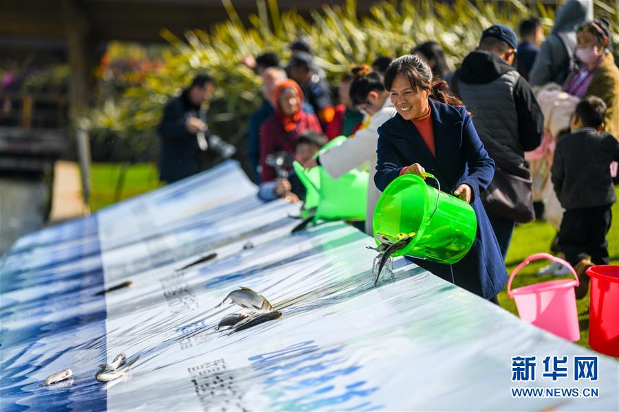 11月23日,市民在活動(dòng)現(xiàn)場投放魚苗。 新華社記者江文耀攝
