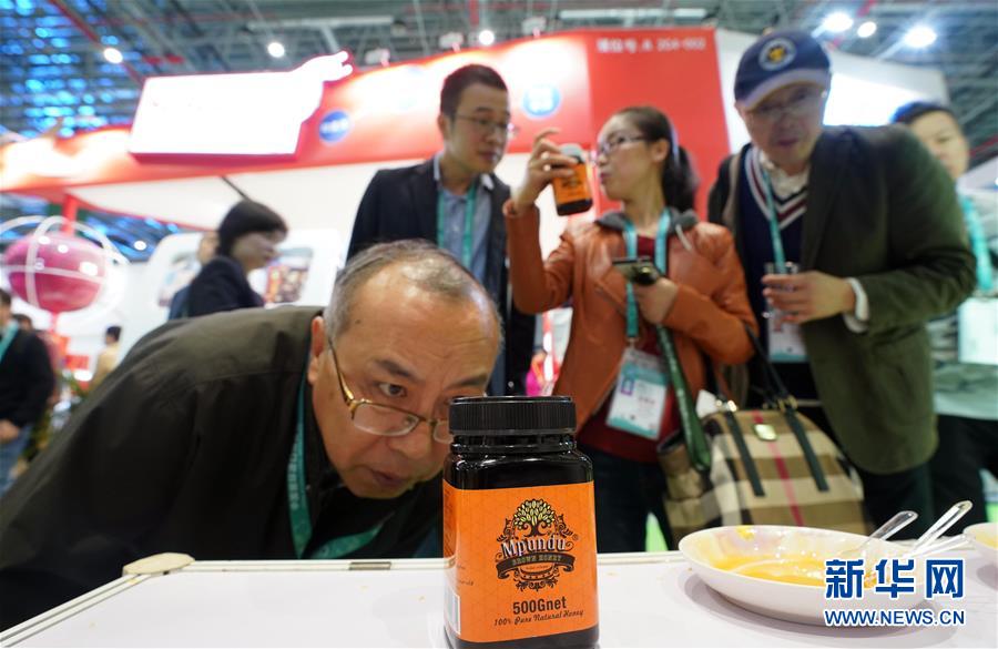 在首屆中國國際進口博覽會上,參觀者在睦朋得野生蜂蜜有限公司展臺觀看蜂蜜展品(11月8日攝)。 新華社記者 程麗 攝