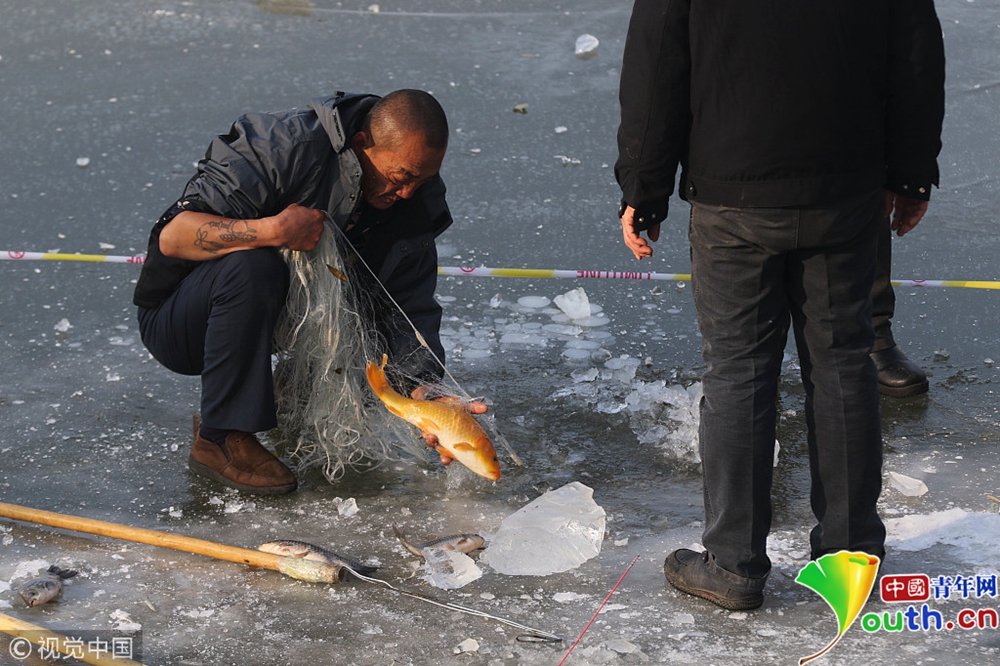 民眾鑿冰下網(wǎng)捕魚(yú)。