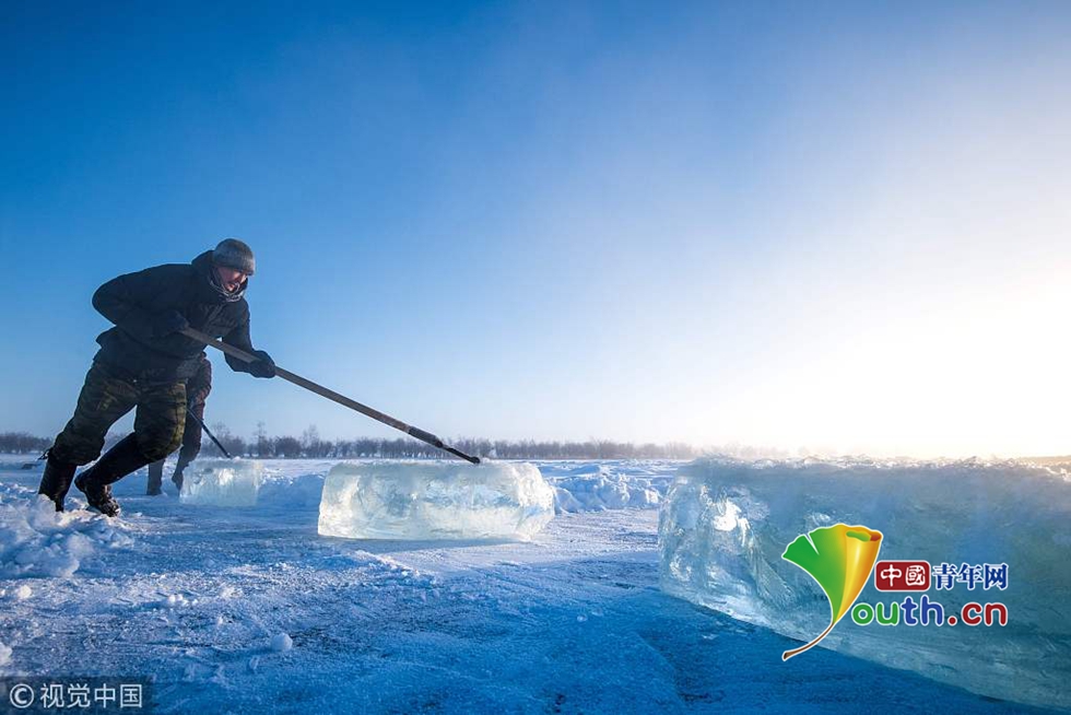 當(dāng)?shù)貢r間2018年11月27日,雅庫茨克,零下41攝氏度左右的氣溫下,村民在當(dāng)?shù)氐囊粋€湖中采集冰塊。當(dāng)?shù)睾芏嗳艘蕾囉谌诨鶋K解決供水,因為多年凍土覆蓋地區(qū)冬季氣溫極低,沒有其他的方式供應(yīng)水。