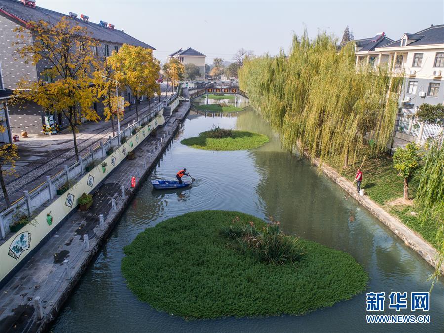 11月28日,長興縣虹星橋鎮(zhèn)港口村東港內(nèi),工作人員在打撈水面漂浮物(無人機拍攝)。東港全長1500米,環(huán)繞港口新村。2012年,新村建成后,港口村通過加固河岸、清理河道、種植浮草等方式對東港進行生態(tài)治理,并由該村黨總支書記孫根法擔(dān)任河長,定期開展巡查,引導(dǎo)村民自覺維護河道整潔。 新華社記者 徐昱 攝