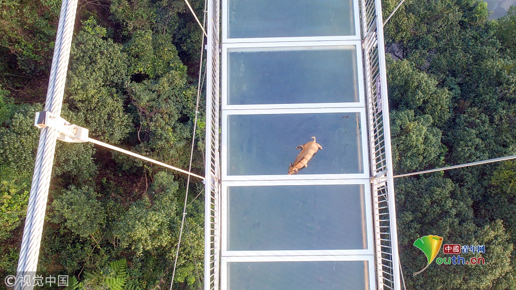 2018年11月29日,一只山豬誤入廣東清遠(yuǎn)古龍峽云天玻霸玻璃橋,結(jié)果被嚇得趴在橋面上發(fā)抖,幾名值班保安齊心協(xié)力將山豬從玻璃橋上解救出來,將其送回森林。