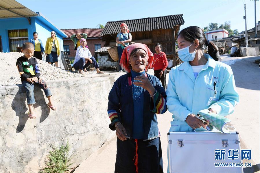 11月28日,張惠仙(中)在出診路上與一位村民交流。 新華社記者 楊宗友 攝