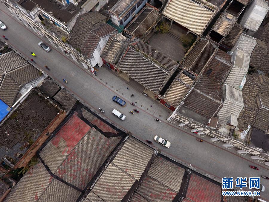 廣西百色靖西市新靖鎮(zhèn)鵝泉村村民從古老的石橋上趕?;卮澹?1月27日無人機拍攝)。