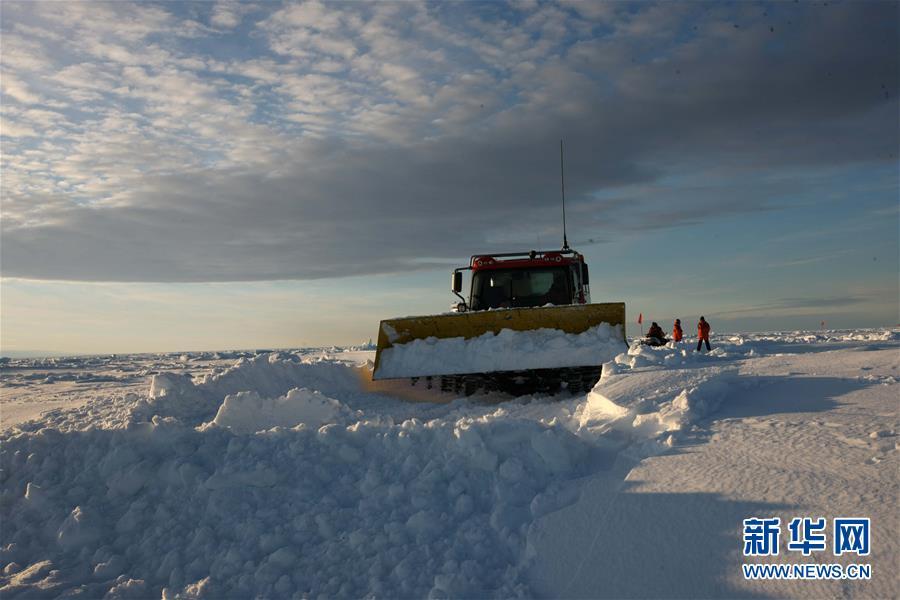 修路小組成員用雪地車裝備的鏟斗推平積雪(12月1日攝)。 搭載中國第35次南極科考隊的“雪龍”號極地考察船日前到達距離中山站44公里處的陸緣冰區(qū),準(zhǔn)備迎來本次南極科考首場攻堅戰(zhàn)——物資卸運。一支探冰小組隨即展開海冰探路,以期盡快打通從“雪龍”號到中山站的冰上運輸線,盡早啟動冰上運貨。 新華社記者 劉詩平 攝