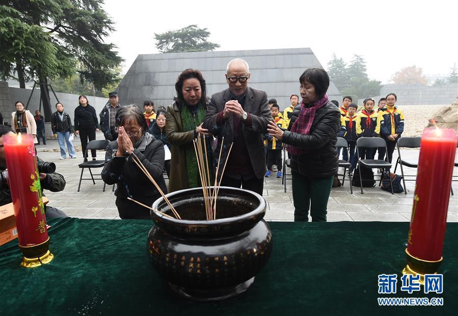 12月3日,南京大屠殺幸存者余昌祥(前排左三)、石秀英(前排左二)在家祭活動現(xiàn)場。 當(dāng)日,在第五個(gè)南京大屠殺死難者國家公祭日到來之際,南京大屠殺死難者遺屬家祭活動在侵華日軍南京大屠殺遇難同胞紀(jì)念館正式啟動。首批前來開展家祭活動的南京大屠殺幸存者余昌祥、石秀英老人分別率家屬在紀(jì)念館內(nèi)的死難者名單墻前獻(xiàn)花、敬香、跪拜,并誦讀家信,表達(dá)對親人的哀思。 新華社記者 孫參 攝