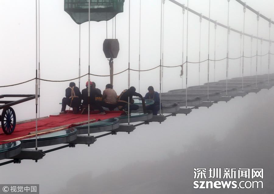 深圳新聞網(wǎng)訊 2018年12月3日,在浙江玉環(huán)市上棧頭玻璃吊橋建設(shè)工地上,工人們正在北端橋頭鋪設(shè)橋面4厘米厚的玻璃,預(yù)計46個箱梁的玻璃全部鋪設(shè)完成需到5日,然后再進(jìn)入安裝兩側(cè)護(hù)欄和拉攀抗風(fēng)拉索,吊橋工程竣工定于23日,準(zhǔn)備在2019年元旦試運(yùn)行。