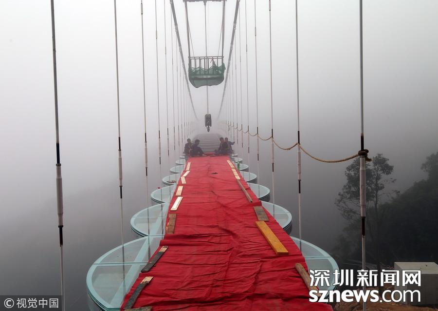 深圳新聞網(wǎng)訊 2018年12月3日,在浙江玉環(huán)市上棧頭玻璃吊橋建設(shè)工地上,工人們正在北端橋頭鋪設(shè)橋面4厘米厚的玻璃,預(yù)計(jì)46個(gè)箱梁的玻璃全部鋪設(shè)完成需到5日,然后再進(jìn)入安裝兩側(cè)護(hù)欄和拉攀抗風(fēng)拉索,吊橋工程竣工定于23日,準(zhǔn)備在2019年元旦試運(yùn)行。