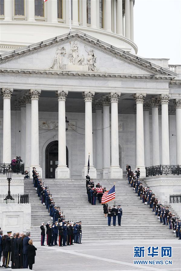 12月5日,在美國首都華盛頓,美國前總統(tǒng)喬治·赫伯特·沃克·布什的靈柩被安放在國會大廈前的靈車上。