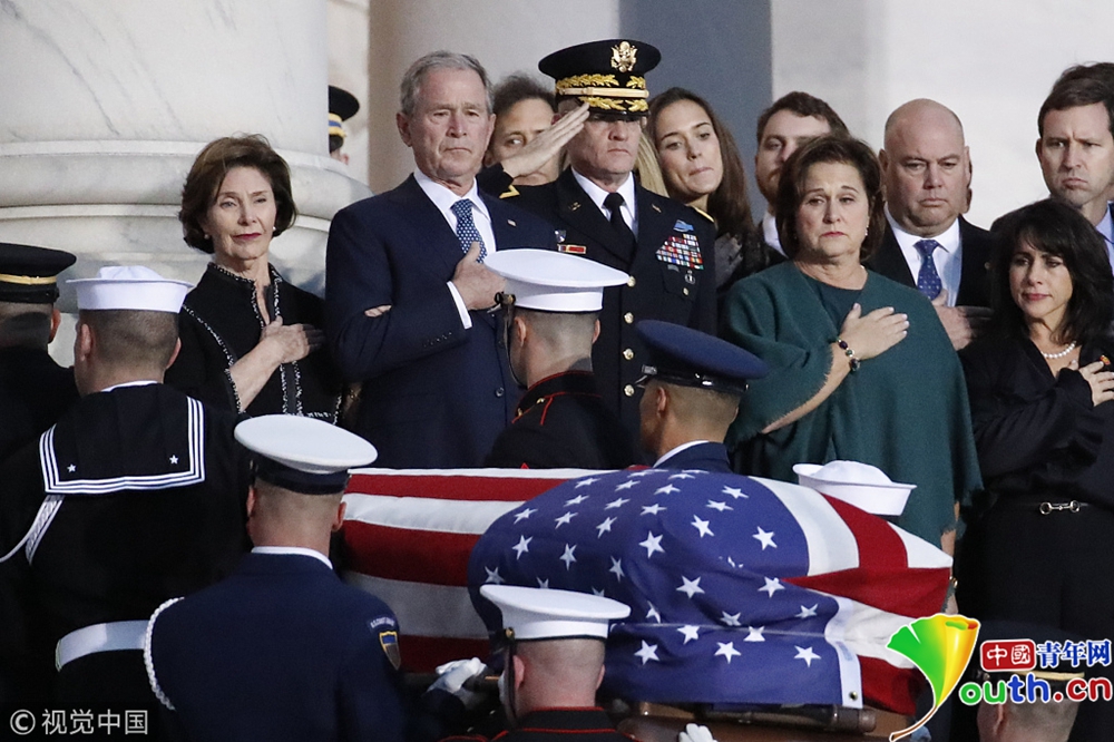 美國第41任總統(tǒng)喬治·赫伯特·沃克·布什(老布什)的靈柩從他的家鄉(xiāng)休斯頓運(yùn)抵首都華盛頓市郊,他的遺體將從當(dāng)天晚上開始放于國會(huì)圓形大廳,供民眾瞻仰。