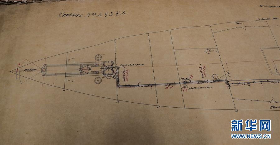 這是11月2日在英國紐卡斯?fàn)柕奶┒鳌枡n案館拍攝的致遠(yuǎn)艦設(shè)計(jì)圖紙。 新華社記者日前在紐卡斯?fàn)柼┒鳌枡n案館查找北洋海軍史料時(shí)發(fā)現(xiàn)一套七張、檔案名為“中國巡洋艦舵機(jī)設(shè)計(jì)圖”的原始圖紙。塵封百年,甲午海戰(zhàn)中抗擊日艦后沉沒的清北洋海軍致遠(yuǎn)艦部分原廠設(shè)計(jì)圖紙?jiān)谄浣ㄔ斓亍~卡斯?fàn)柺械囊患覚n案館首次被發(fā)現(xiàn),為打撈那段悲壯的歷史提供了重要參考。 新華社記者 韓巖 攝