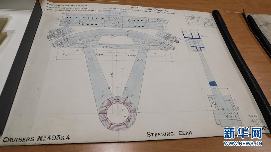 這是11月2日在英國紐卡斯?fàn)柕奶┒鳌枡n案館拍攝的致遠(yuǎn)艦設(shè)計圖紙。 新華社記者日前在紐卡斯?fàn)柼┒鳌枡n案館查找北洋海軍史料時發(fā)現(xiàn)一套七張、檔案名為“中國巡洋艦舵機(jī)設(shè)計圖”的原始圖紙。塵封百年,甲午海戰(zhàn)中抗擊日艦后沉沒的清北洋海軍致遠(yuǎn)艦部分原廠設(shè)計圖紙在其建造地——英國紐卡斯?fàn)柺械囊患覚n案館首次被發(fā)現(xiàn),為打撈那段悲壯的歷史提供了重要參考。 新華社記者 韓巖 攝