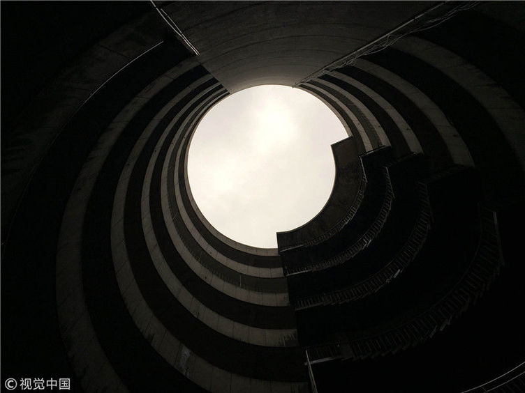 2018年12月6日,重慶江北紅旗河溝汽車站內(nèi),有一棟獨(dú)特的八層圓環(huán)狀建筑,底層每天有不少進(jìn)出站的客車通行。據(jù)悉,這棟樓建于1990年,曾經(jīng)是車站旅館,如今一、二兩層用于車站辦公,其余樓層已廢棄。為確保安全,三層以上已經(jīng)被封鎖。圖為公交車穿過8層空心圓筒樓。徐勇/視覺中國