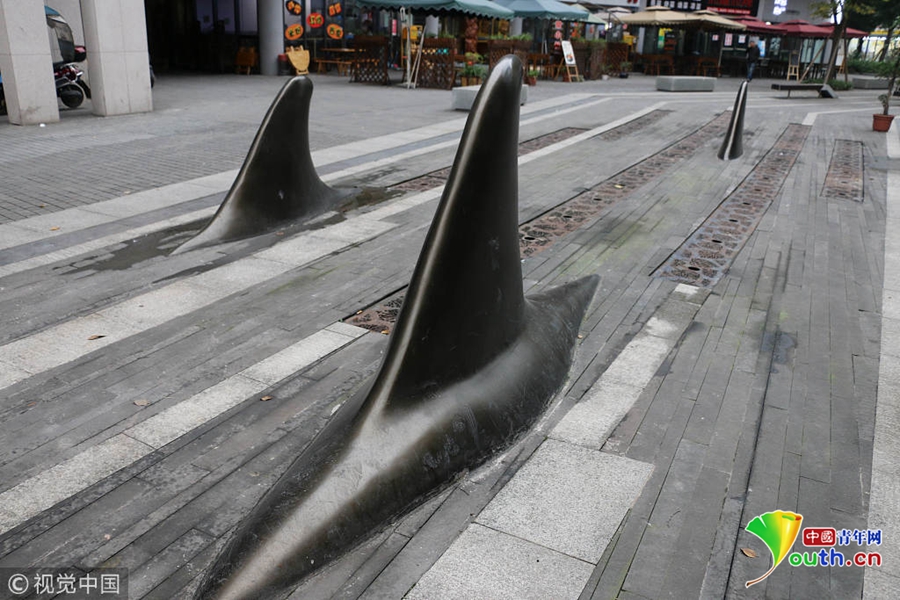 2018年11月20日,重慶一園區(qū)內(nèi)馬路中間突出一排“鯊魚鰭”,司機路人都被“嚇懵”了。突出的鯊魚鰭將兩側(cè)的車行道分開,原來,這是為了進(jìn)一步保證車流的有序進(jìn)出和行人過街安全,同時也為了防止亂停車占用人行道,設(shè)置了這種異形“隔離樁”。圖片來源:視覺中國