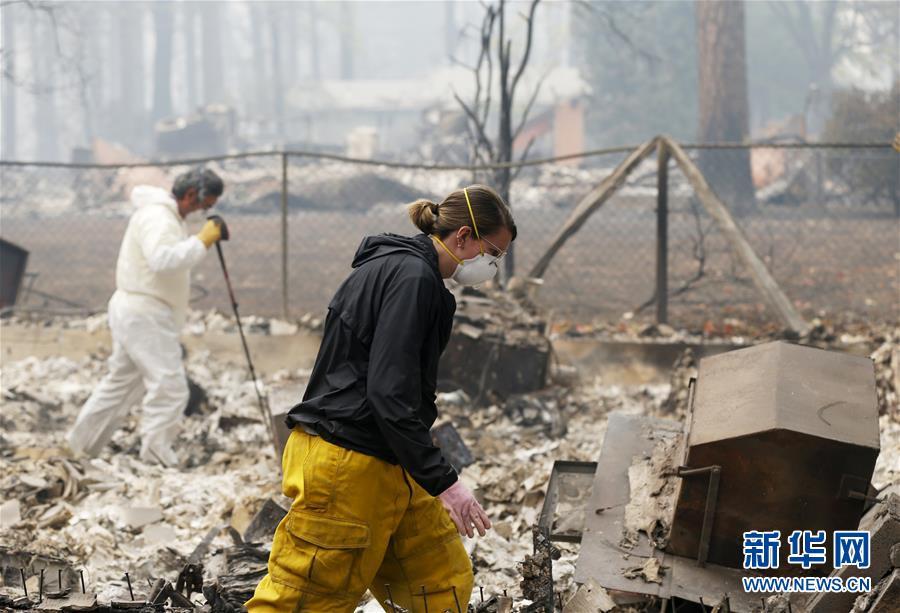 11月13日,在美國(guó)加利福尼亞州天堂鎮(zhèn),搜救人員在山火過(guò)后的廢墟工作。