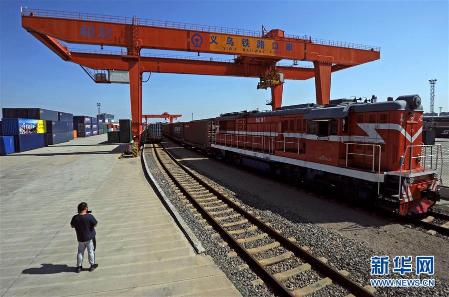 在浙江義烏鐵路西站,一列駛往西班牙馬德里的中歐班列(義烏)緩緩發(fā)車(10月27日攝)。 新華社記者 譚進 攝