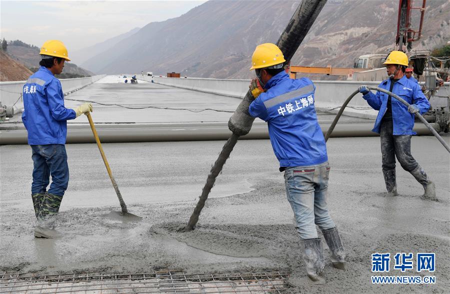 12月15日,中鐵上海局集團(tuán)公司的施工人員在東格高速公路土建項(xiàng)目中進(jìn)行橋面鋪裝作業(yè)。新華社記者楊宗友攝