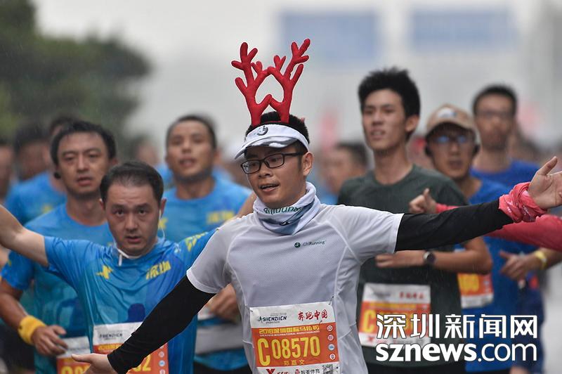 2018年12月16日,深圳國際馬拉松位于后海的折返點(diǎn),一名頭戴圣誕鹿角頭箍的選手正在向終點(diǎn)沖刺。
