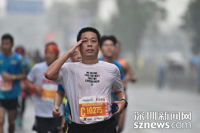 2018年12月16日,深圳國際馬拉松位于后海的折返點(diǎn),距離終點(diǎn)不遠(yuǎn)處,一位穿著八路軍服裝的選手正在沖刺。