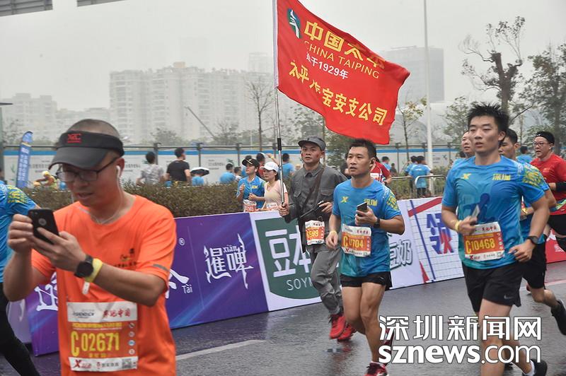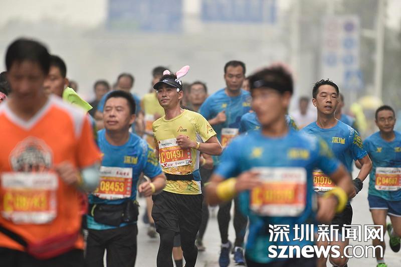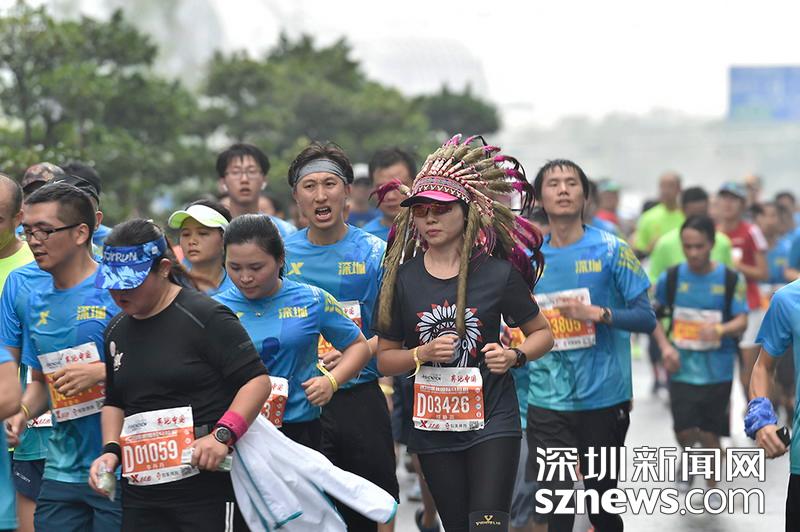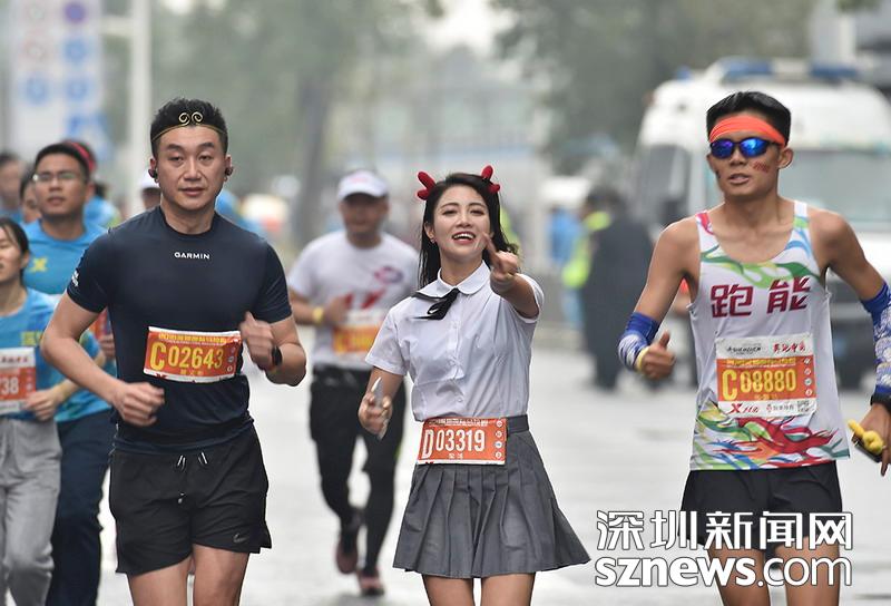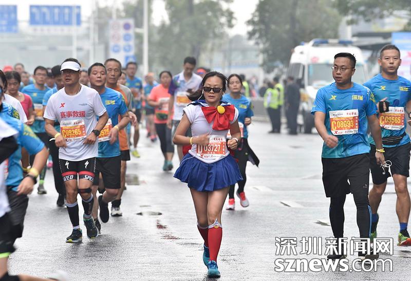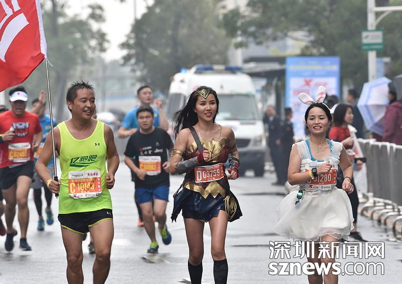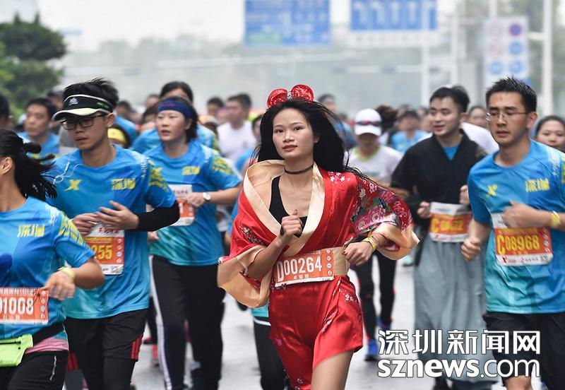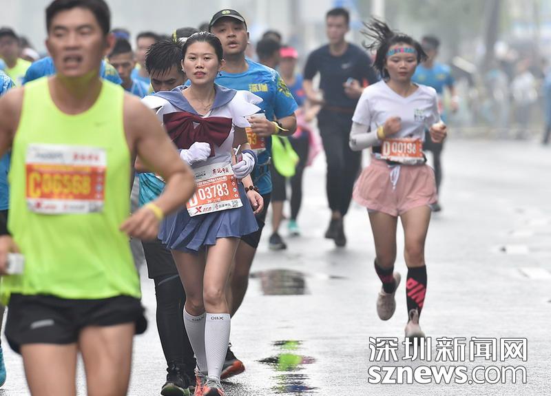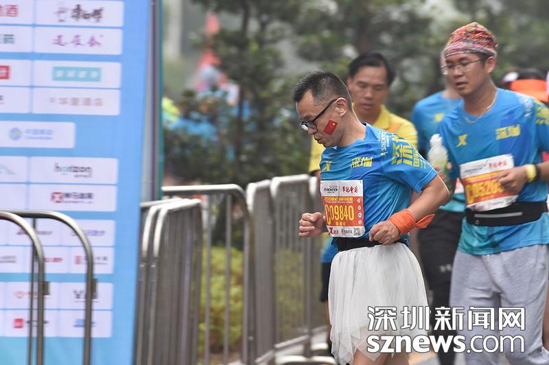 2018年12月16日,深圳國際馬拉松位于后海的折返點(diǎn),三名選手正在向終點(diǎn)沖刺,跟其他選手不同,其中兩位選手選擇了自己搭配服裝參賽。