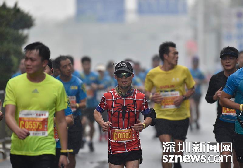 2018年12月16日,深圳國際馬拉松位于后海的折返點(diǎn),一名身著“蜘蛛俠”短袖選手正在向終點(diǎn)沖刺。