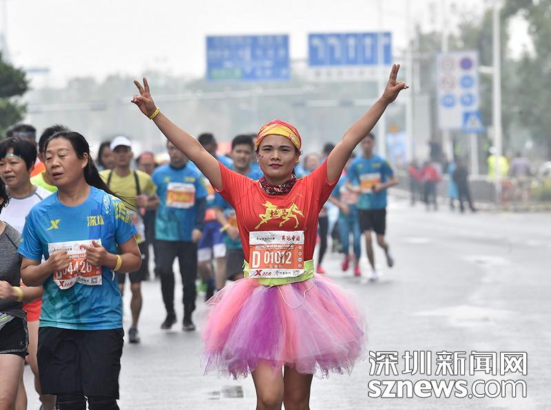 2018年12月16日,深圳國際馬拉松位于后海的折返點(diǎn),一名著女式短裙的選手正在向終點(diǎn)沖刺。