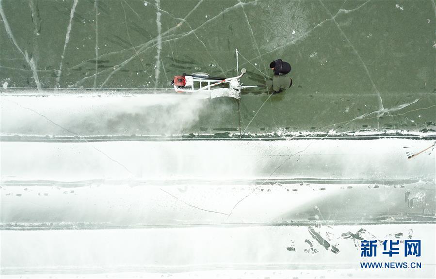 在松花江哈爾濱段江面,工人們在進(jìn)行切割和采冰工作(12月12日無人機拍攝)。 黑龍江哈爾濱市的冰雪主題樂園哈爾濱冰雪大世界的采冰和建設(shè)工作近日拉開帷幕。為保證足夠的優(yōu)質(zhì)冰供給,每天有近千名采冰人和700多輛運冰車參與到采冰工作。 新華社記者 王松 攝