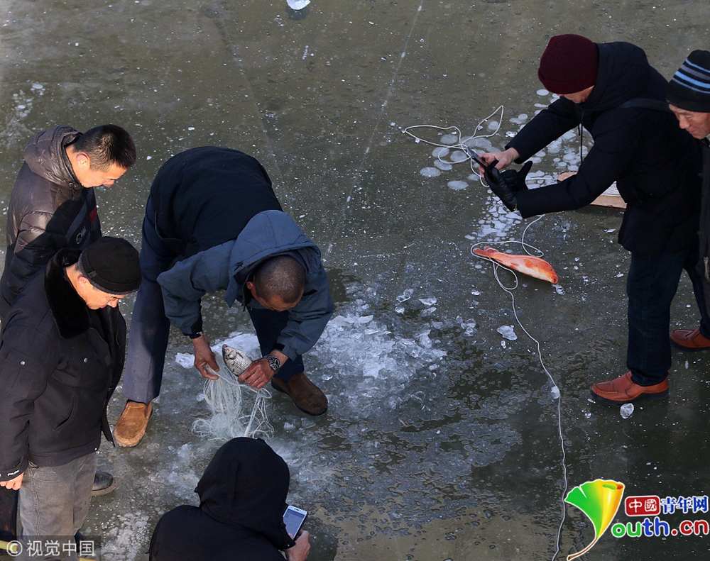 2018年11月25日,黑龍江省哈爾濱市,松花江封江不久,已經(jīng)有人蹬江鑿冰下網(wǎng)捕魚。 圖片來源:視覺中國