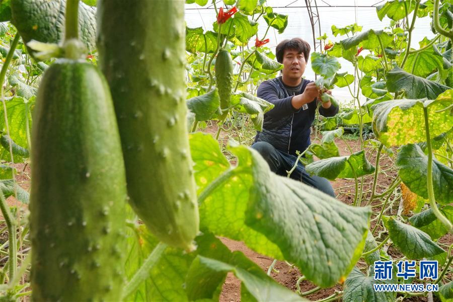 12月20日,唐山市豐潤區(qū)百草坡農(nóng)產(chǎn)品農(nóng)民專業(yè)合作社社員在大棚內(nèi)管護黃瓜。