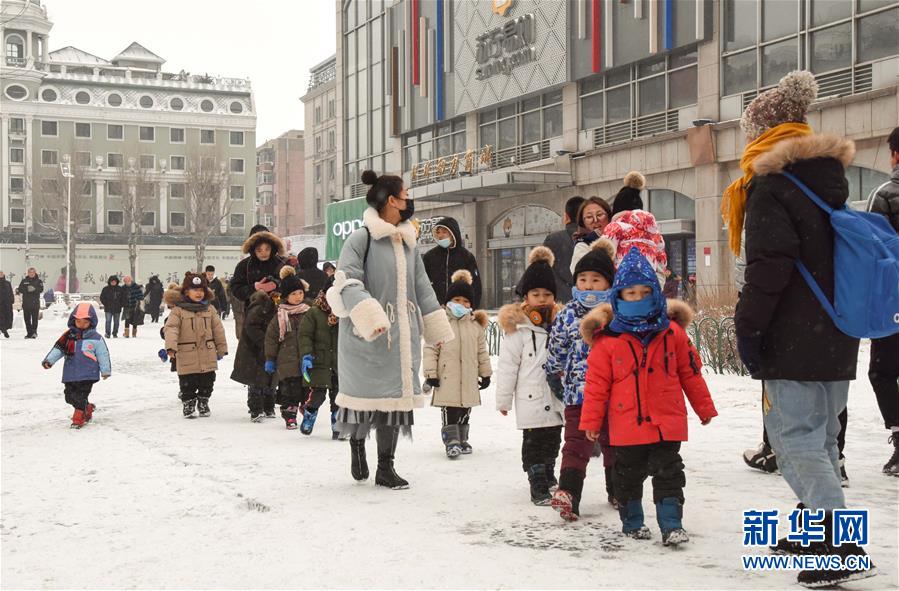 12月21日,游客在哈爾濱中央大街游覽。當(dāng)日,“冰城”哈爾濱迎來降雪天氣,整個(gè)城市變得銀裝素裹。新華社記者韓宇攝