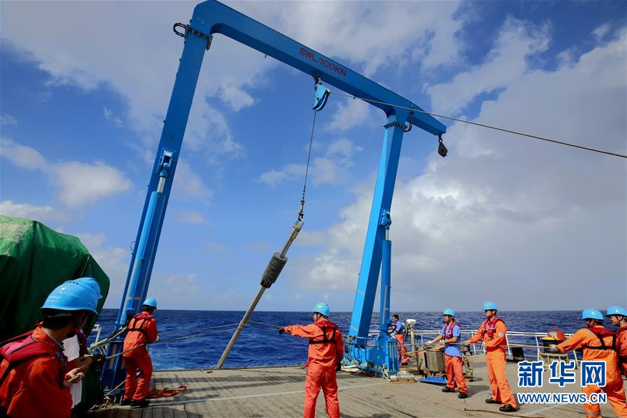 科考團(tuán)隊(duì)成員在船上布放重力柱(12月21日攝)。
