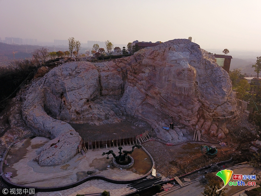 廢棄工地建蜂巢酒店 百名工人用時(shí)半年雕出巨型山體石獅