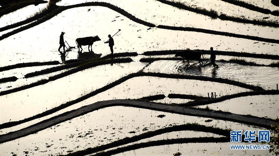 4月10日清晨,湖北省蘄春縣霧云山村的農民在梯田勞作。 在即將過去的2018年,各地攝影師用鏡頭記錄下四季中國。大江南北,一幅幅色彩斑斕的美麗畫卷徐徐展開。 新華社記者 程敏 攝