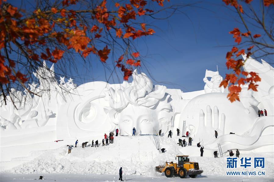 2018年12月13日,黑龍江省哈爾濱市,國內(nèi)最大的雪雕盛會太陽島雪博會正在緊鑼密鼓建設(shè)中,部分雪雕雛形已現(xiàn),雪雕師正在精雕細刻打磨中。