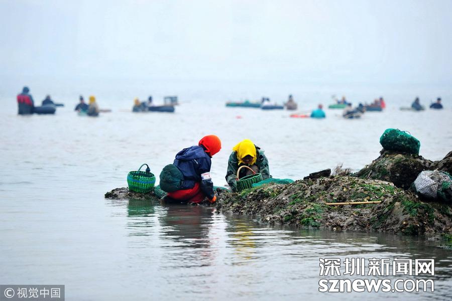 深圳新聞網(wǎng)2018年12月25日訊 二十四節(jié)氣冬至適逢天文大潮,西海岸新區(qū)唐島灣南岸,來自附近十余公里甚至青島市區(qū)的市民來到退潮后的灣底,在齊腰深的海水中挖拾牡蠣(海蠣子)或在沙灘上挖拾蛤蜊。經(jīng)過近2個多小時的辛勤勞作,市民們收獲滿滿返回。