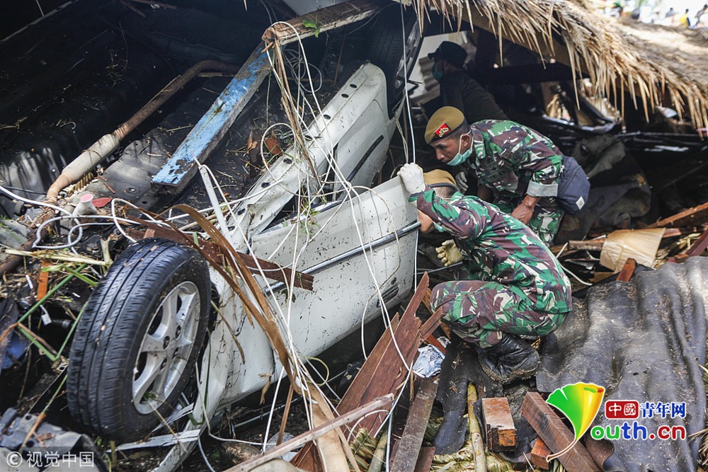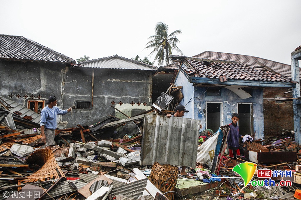 12月24日,受災民眾在印尼萬丹省海嘯災區(qū)進行清理工作。 印度尼西亞抗災署發(fā)言人24日說,印尼西部巽他海峽海嘯死亡人數(shù)已經(jīng)上升至373人。 新華社記者 張可任 攝