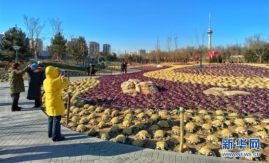 12月24日,游人在北京玉淵潭公園觀賞甘藍(lán)。 日前,北京市玉淵潭公園移栽的三萬(wàn)多棵紫色和黃色羽衣甘藍(lán)盛開,為冬季公園增添了色彩。 新華社記者李欣攝