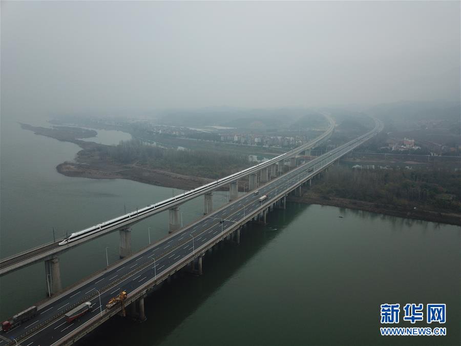 ↑12月25日,D9551次首發(fā)列車(chē)駛過(guò)富春江特大橋(無(wú)人機(jī)拍攝)。新華社記者 邢廣利 攝