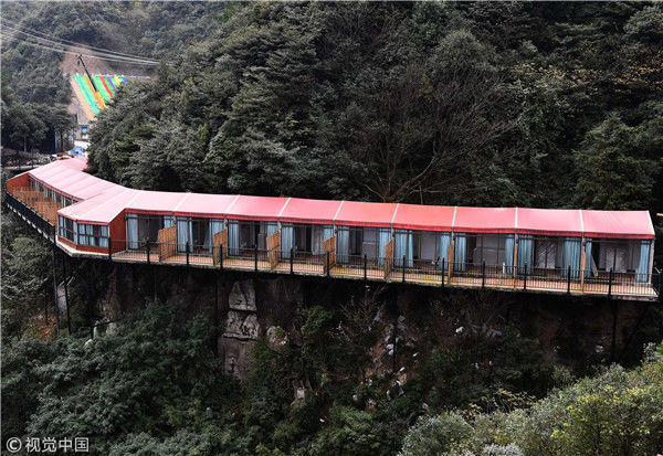 2017年11月16日,重慶萬盛一景區(qū)內(nèi)的臨崖酒店依山而建,色彩絢麗如山間彩虹。據(jù)介紹,該酒店位于當(dāng)?shù)貖W陶紀景區(qū)內(nèi),酒店順著山形而建盤旋在山間,特別顯眼。 周毅(重慶分社)/中新社/視覺中國